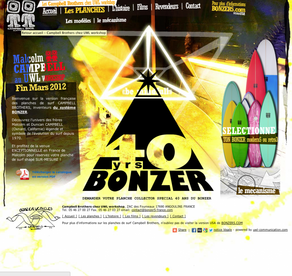 Site réalisé pour la venue du shaper Malcolm CAMPBELL. Fabricant de planche de surf sur mesure. Il est à l’origine du Bonzer.